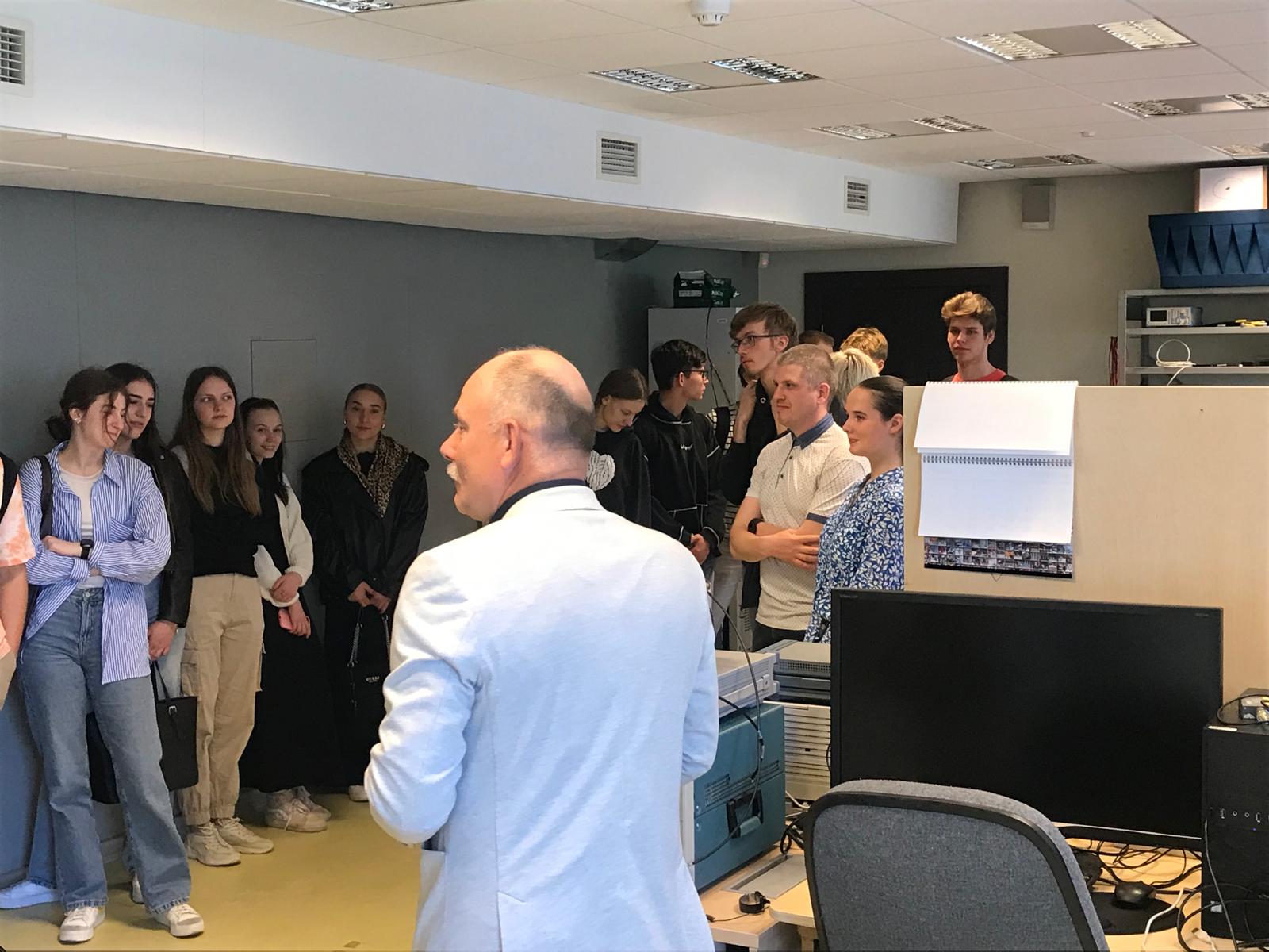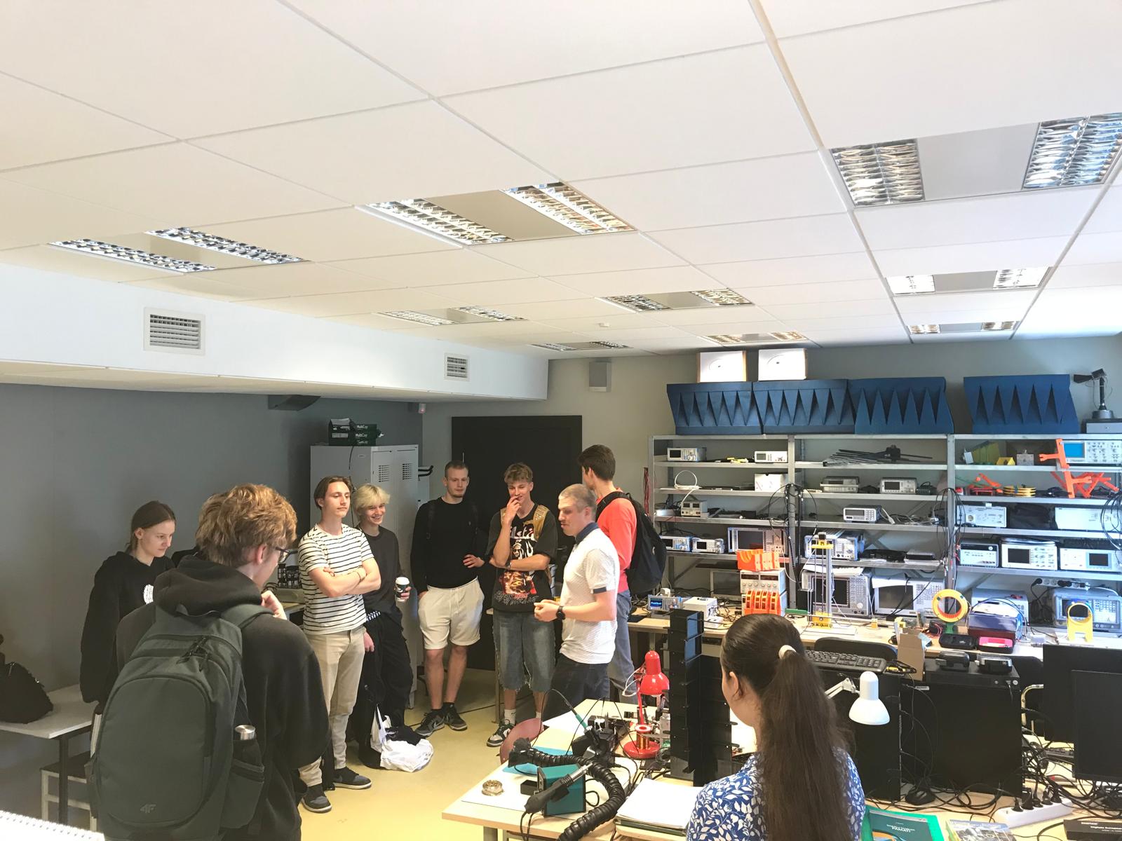 Šeit pie mums viesojas profesors Juris Blūms ar padziļinātā kursa “Fizika II” skolēniem, kam arī ir interese par to, kas notiek RTU, zinātnē un laboratorijās, kā arī, kādas iespējas RTU viņiem spēs sniegt kā topošajiem studentiem.